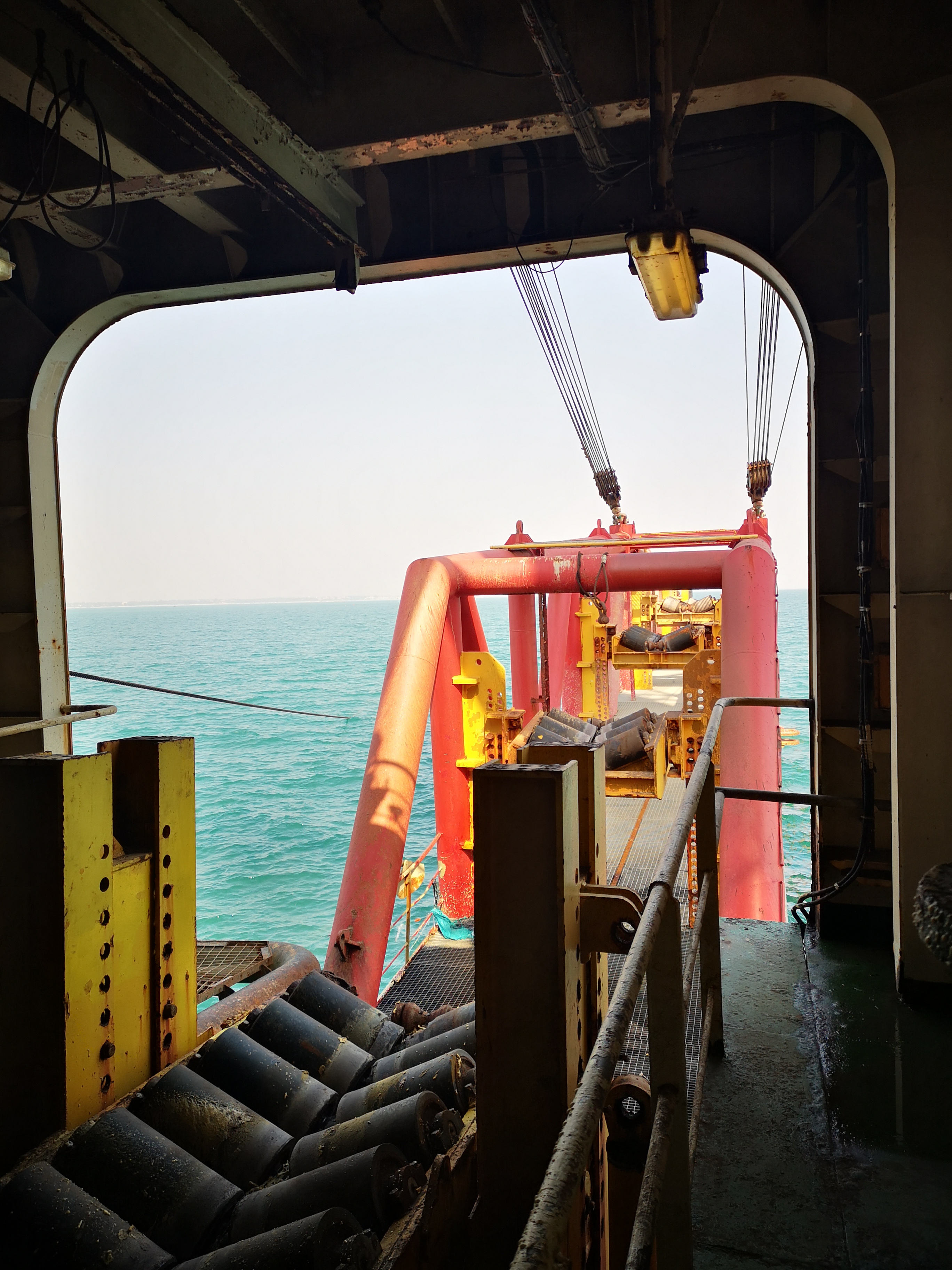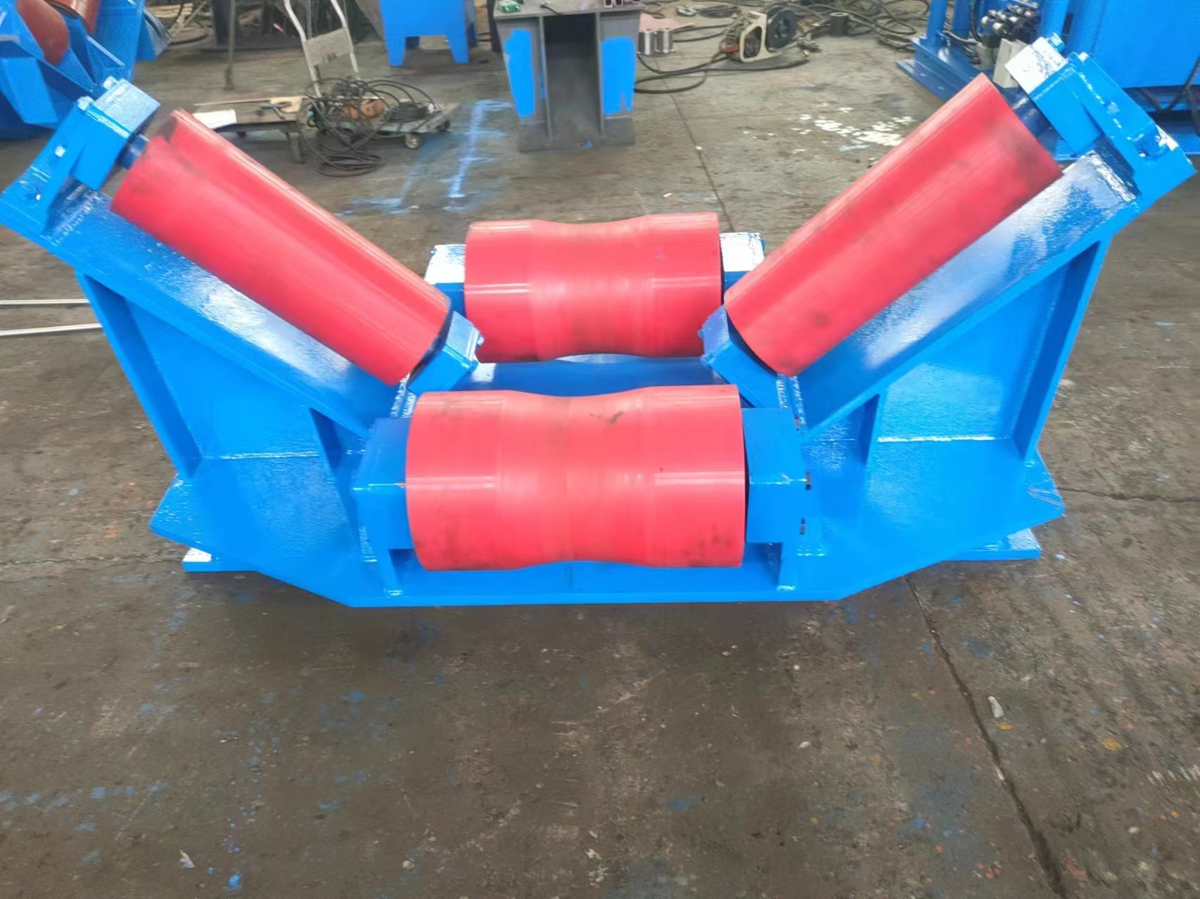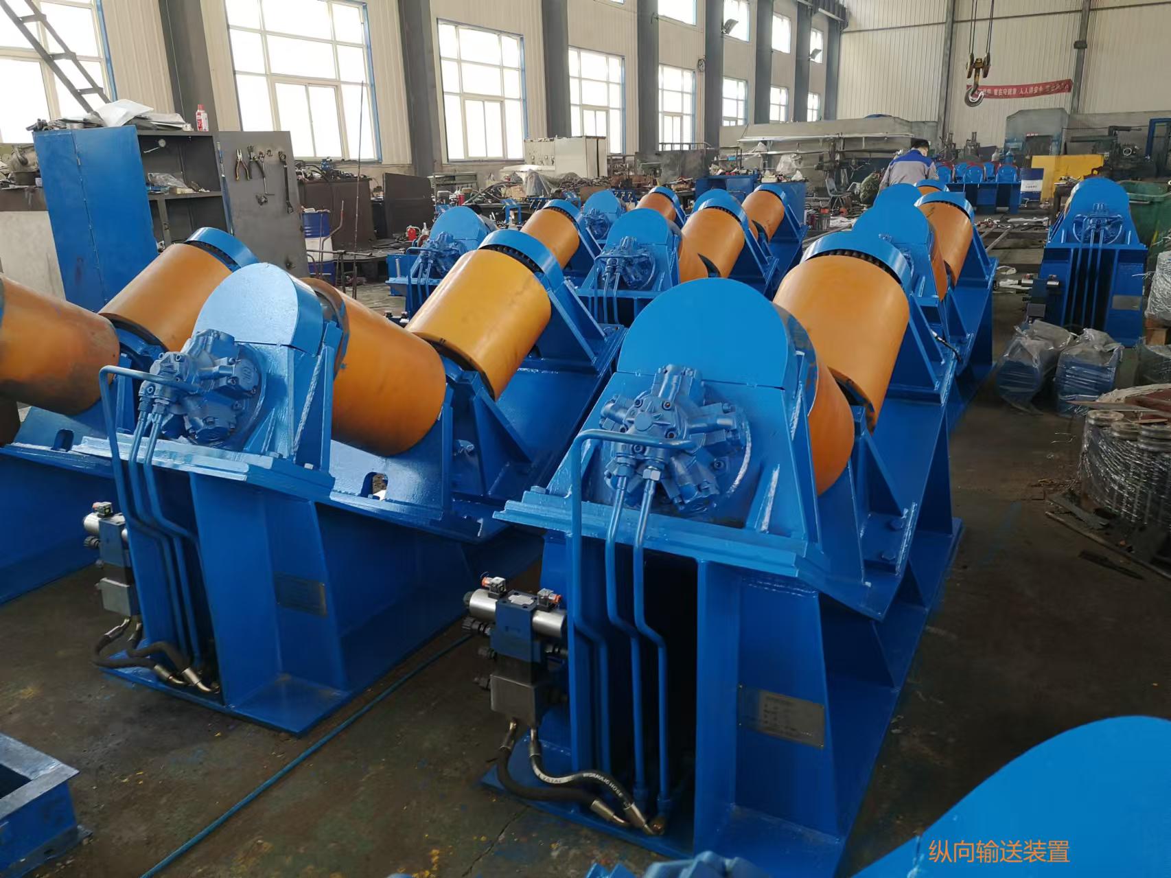滚轮输送系统是船用张紧器的辅助设备用于将管道纵向-横向-纵向输送至张紧器,并能在将管道输送到位后,通过对中装置将两根管道调整为一个轴心线。